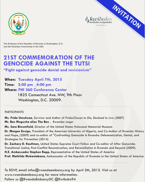 “The Role of Media and Literature Before, During, and After Genocide.” Conference: 18th Annual Commemoration of the Rwandan Genocide. Co-Hosts: The Embassy of the Republic of Rwanda in the United States and the Rwandan Community in North America. Venue: Georgetown University. …
